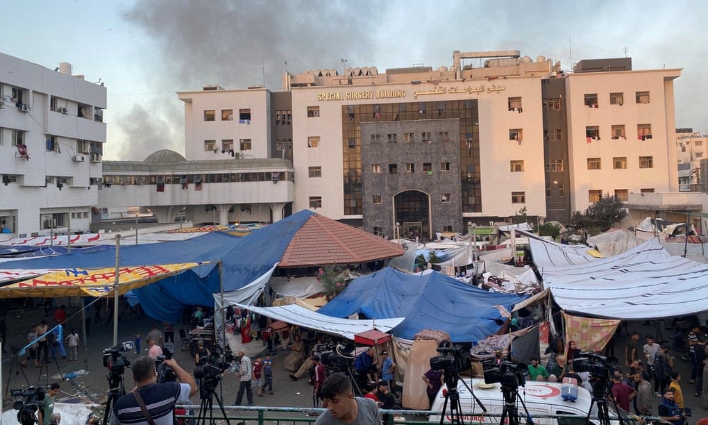 Palestinians trapped inside Gaza’s biggest hospital were digging a mass grave on Tuesday to bury patients who died under the apartheid regime’s encirclement.