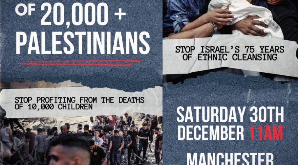 Protest against Israel’s ongoing murder of Palestinians! Join the protest on Saturday 30 December, 11:00 am. Meet at Piccadilly Gardens.
