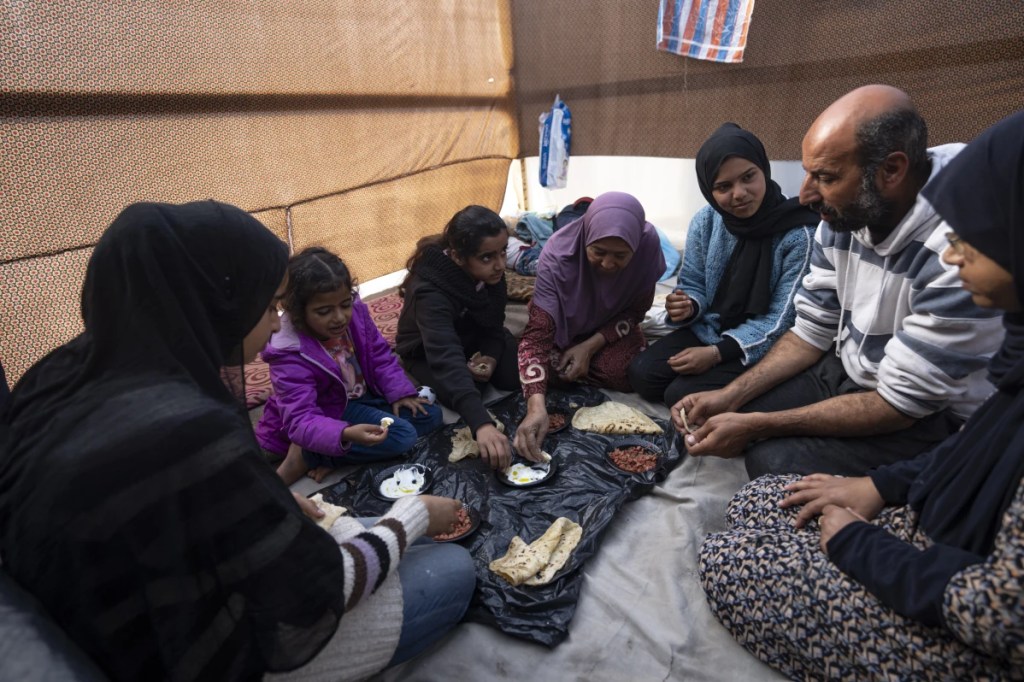 A Gazan family having a meagre breakfast in a makeshift tent.