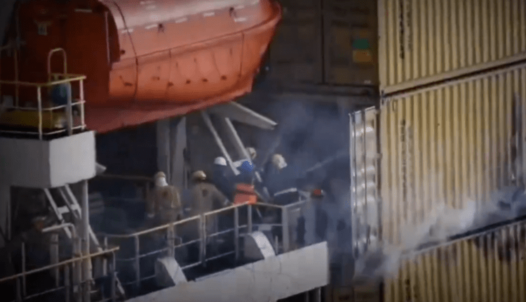 Fire erupting in a number of containers onboard the Israeli ship MSC Sky II, which the Yemeni armed forces had targeted in the Arabian Sea on Monday.