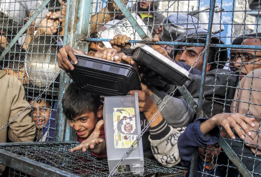 A crowd of starving Palestinians, including children, waits to receive food distributed by charity organizations amid Israel’s blockade as the situation dramatically deteriorates at the Jabaliya refugee camp in Gaza.
