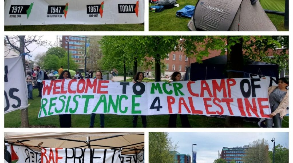 “In Manchester, activists and community, must show support for the students, and must keep showing solidarity with the Palestinians and their struggle for liberation. Join us at the camp on Brunswick Park, Brunswick St., Manchester M13 9PL.”
