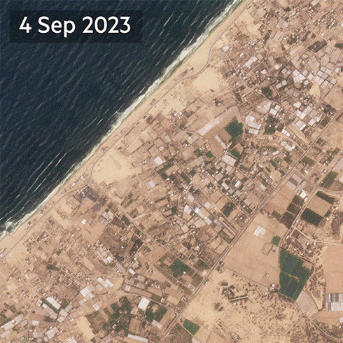 Satellite imagery of the densely packed tent city of Al-Mawasi