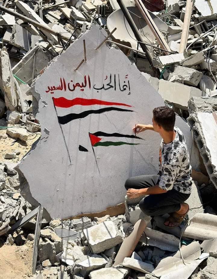 From Gaza to Yemen, a young man paints a mural on the rubble of a destroyed home.
