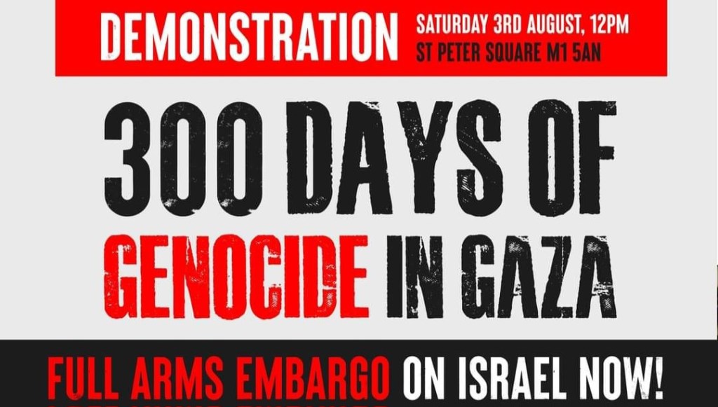 All out on Saturday 03 August, 12pm, St. Peter’s Square. 300 days of genocide in Gaza! Full arms embargo on Israel now!