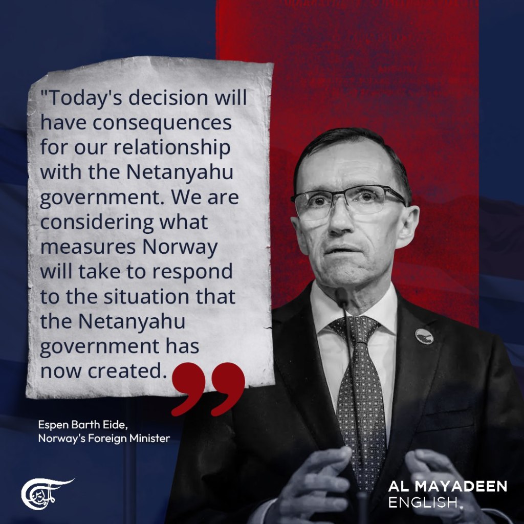 Foreign Minister Espen Barth Eide said in a statement referring to Israeli Prime Minister Benjamin Netanyahu, “Today’s decision will have consequences for our relationship with the Netanyahu government. We are considering what measures Norway will take to respond to the situation that the Netanyahu government has now created.”