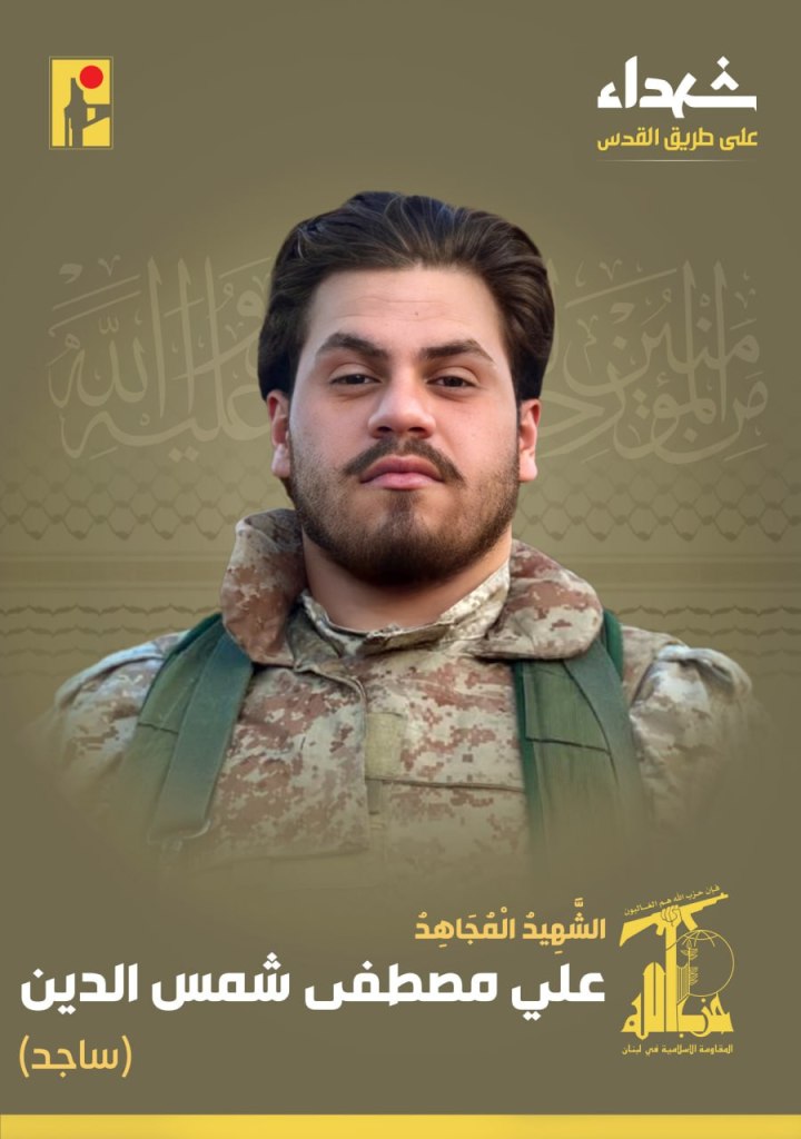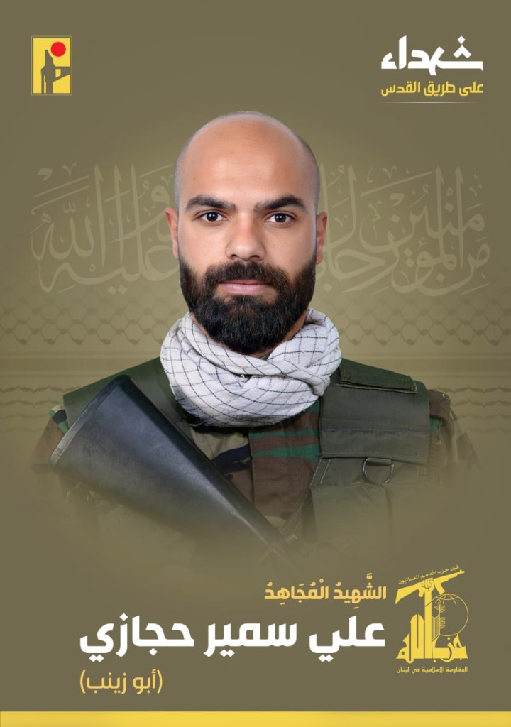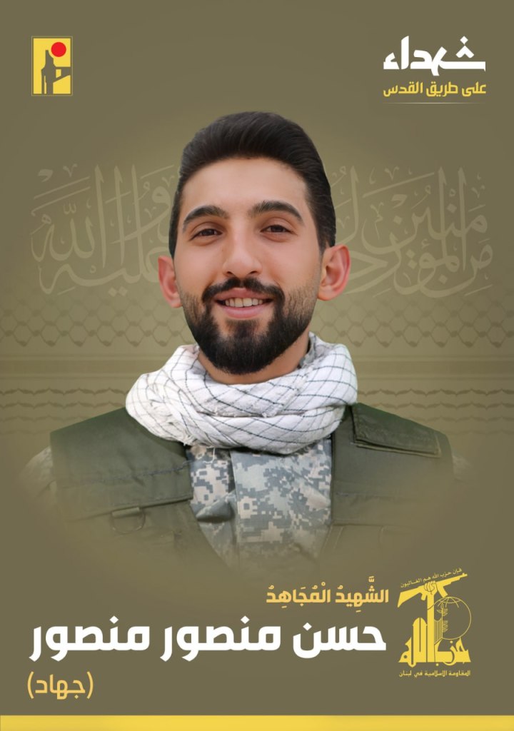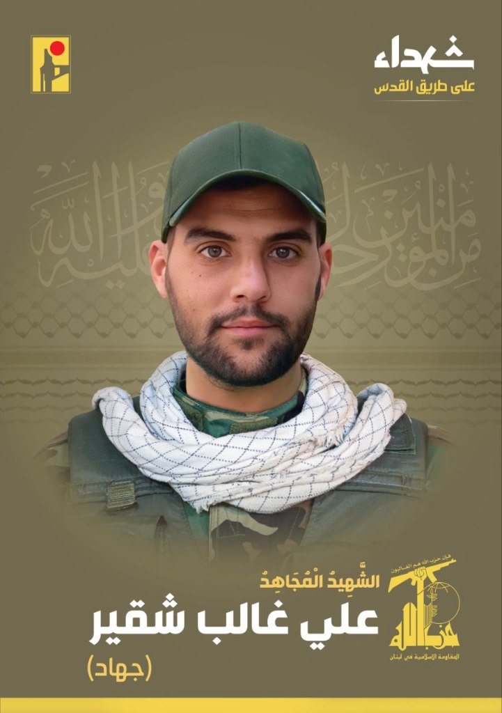 Screenshot from a Hezbollah videoWith great pride and honor, the Islamic Resistance exalts the martyr fighter Ali Ghalib Shqeir “Jihad,” born in 1996 in the town of Mais Al-Jabal in southern Lebanon, who rose as a martyr on the road to Al-Quds. https://t.me/PalestineResist/51591With great pride and honor, the Islamic Resistance exalts the martyr fighter Ali Jamal Al-Din Jawad “Karbala,” born in 1987 in the town of Zebdine in southern Lebanon, who rose as a martyr on the road to Al-Quds. https://t.me/PalestineResist/51688With great pride and honor, the Islamic Resistance exalts the martyr fighter Hassan Mansour Mansour “Jihad”, born in 1998 in the town of Jibchit in southern Lebanon, who rose as a martyr on the road to Al-Quds. https://t.me/PalestineResist/51793With great pride and honor, the Islamic Resistance announces the martyrdom of the fighter Hussein Ali Yassin “Karrar”, born in 1993 from the town of Sultaniyeh in southern Lebanon, who was martyred on the road to Al-Quds. https://t.me/PalestineResist/51810With great pride and honor, the Islamic Resistance exalts the martyr fighter Amin Hassan Badreddine, “Thul Fiqar,” born in 1988 from the town of Ghobeiry in the southern suburbs of Beirut (Dahiye), who rose as a martyr on the road to Al-Quds. https://t.me/PalestineResist/51811With great pride and honor, the Islamic Resistance exalts the martyr fighter Mohammed Hussein Taleb “Amir,” born in 1992 from the town of Burj Al-Shamali in southern Lebanon, who rose as a martyr on the road to Al-Quds. https://t.me/PalestineResist/51838With great pride and honor, the Islamic Resistance exalts the martyr fighter Ali Mustafa Shamseddine “Sajed,” born in 2003 in the town of Majdal Selm in southern Lebanon, who rose as a martyr on the road to Al-Quds. https://t.me/PalestineResist/51911With great pride and honor, the Islamic Resistance exalts the martyr fighter Hassan Fares Jishi, “Ghaleb,” born in 1986 in the town of Jwayya in southern Lebanon, who rose as a martyr on the road to Al-Quds. https://t.me/PalestineResist/51975With great pride and honor, the Islamic Resistance exalts the martyr fighter Hassan Atef Al-Sayed “Gharib”, born in 1978 from the town of Aitaroun in southern Lebanon, who was martyred on the road to Al-Quds due to his wounds. https://t.me/PalestineResist/52082With great pride and honor, the Islamic Resistance exalts the martyr fighter Hadi Jihad Deeb “Haidar”, born in 1997 from the town of Bafliyeh and a resident of the town of Dbaal in southern Lebanon, who was martyred on the road to Al-Quds due to his wounds. https://t.me/PalestineResist/52145With great pride and honor, the Islamic Resistance exalts the martyr fighter Mohammed Hani Haidar “Abu al-Fadl”, born in 1988 in the town of Blida in southern Lebanon, who rose as a martyr on the road to Al-Quds. https://t.me/PalestineResist/52459With great pride and honor, the Islamic Resistance exalts the martyr fighter Ali Samir Hijazi “Abu Zainab” born in 1997 from the town of Hadatha and resident of the town of Dardghaya in southern Lebanon, who rose as a martyr on the road to Al-Quds. https://t.me/PalestineResist/52463 With great pride and honor, the Islamic Resistance exalts the martyr wounded fighter Hassan Ghadban Mustafa “Jihad”, born in 1994 from the town of Beit Lif in southern Lebanon, who was martyred on the road to Al-Quds due to his wounds. https://t.me/PalestineResist/52475