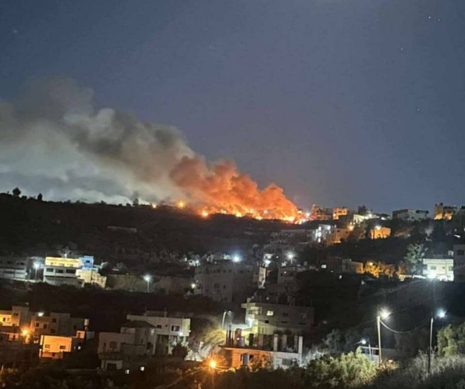 Settlers set fire to ancient olive trees in Khallat al-Lawz, Bethlehem, on the lands of the Al-‘Ubayyat and Al-Mawah families, after placing a caravan and flags in the area two days ago.