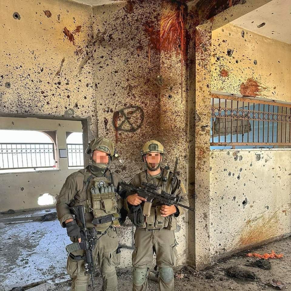 These Israeli soldiers posed for a photo with the remains of a Palestinian they boasted about blowing up in one of the schools they raided in Al-Nuseirat refugee camp in Gaza – Quds News Network.