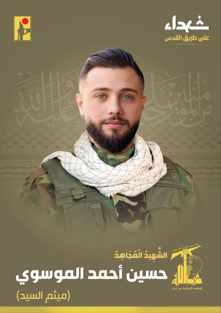 People carry the coffin of Hezbollah senior commander Taleb Sami Abdullah, 55, known within Hezbollah as Hajj Abu Taleb, who was killed late Tuesday by an Israeli strike in south Lebanon, during his funeral procession in the southern suburbs of Beirut, Lebanon, Wednesday, June 12, 2024. AP PhotoWith great pride and honor, the Islamic Resistance exalts the martyr fighter Hussein Ahmad Al-Moussawi “Maytham Al-Sayyed”, born in 1996 from the town of Nabichit in the Bekaa, who rose as a martyr on the road to Al-Quds. https://t.me/PalestineResist/55698With great pride and honor, the Islamic Resistance exalts the martyr fighter Mohammed Hassan Taha “Karrar”, born in 1972 from the city of Baalbek in the Bekaa, who rose as a martyr on the road to Al-Quds. https://t.me/PalestineResist/54907