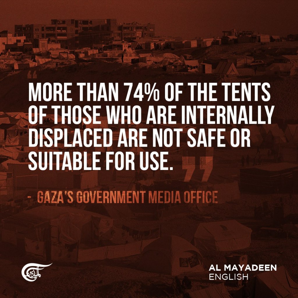 “Government field assessment teams report 74% of displaced people’s tents in Gaza are now unusable. Out of 135,000 tents, 100,000 need immediate replacement due to severe deterioration from intense heat and 11 months of displacement. Conditions remain dire.” QNN