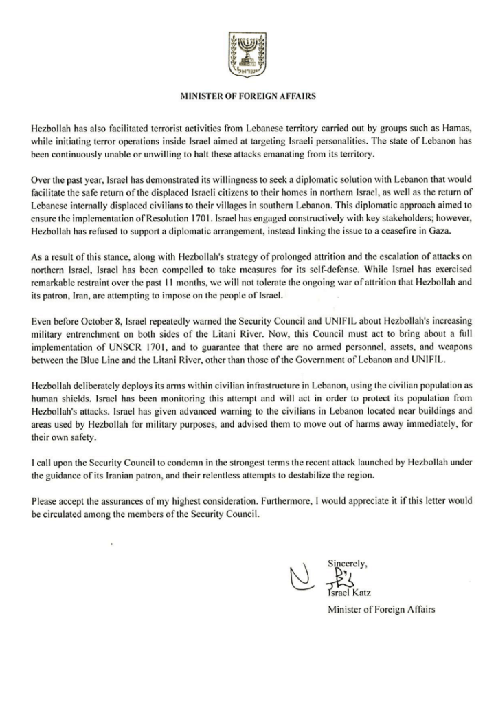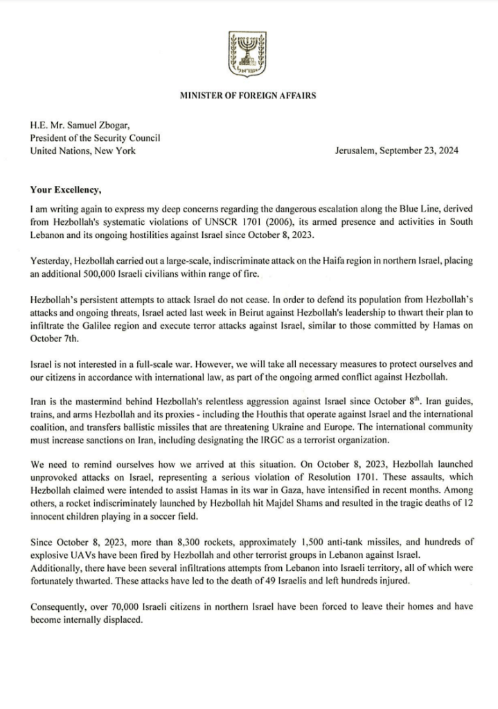 Israel’s foreign minister has written to the president of the UN Security Council (UNSC) demanding that it works to fully implement resolution 1701 and “guarantee” Hezbollah’s full withdrawal from the south of Lebanon.
