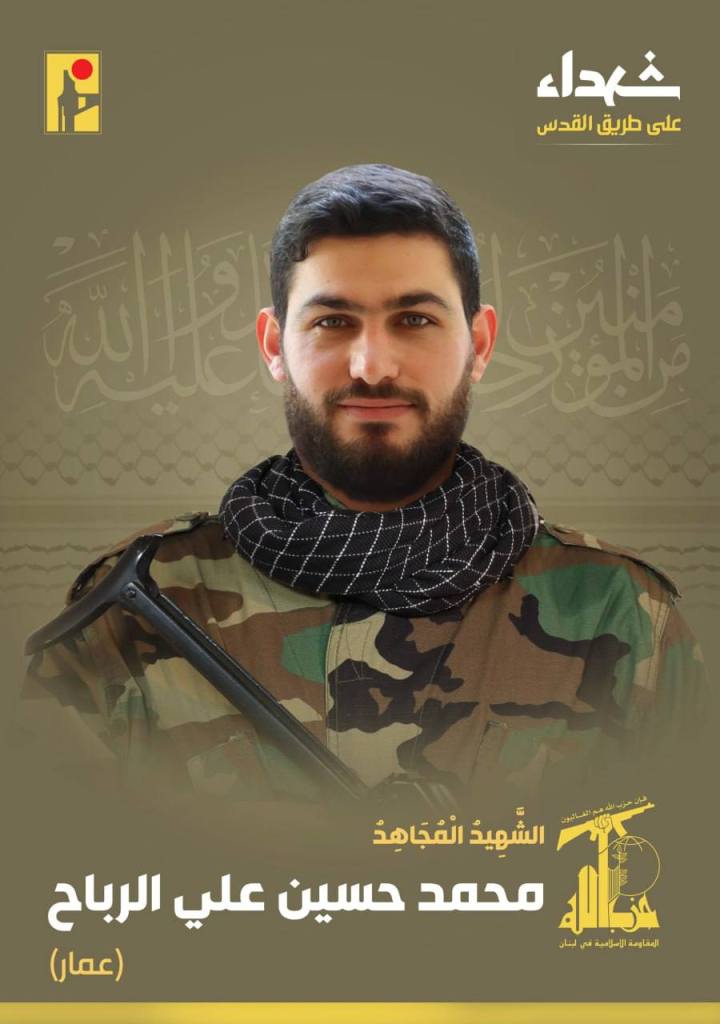 With great pride and honor, the Islamic Resistance exalts the martyr fighter Mohammad Hussein Ali al-Rabah ‘Ammar’, born in 1990 from the town of Tamnin al-Fawqa in the Bekaa, who ascended as a martyr on the path to Al-Quds.