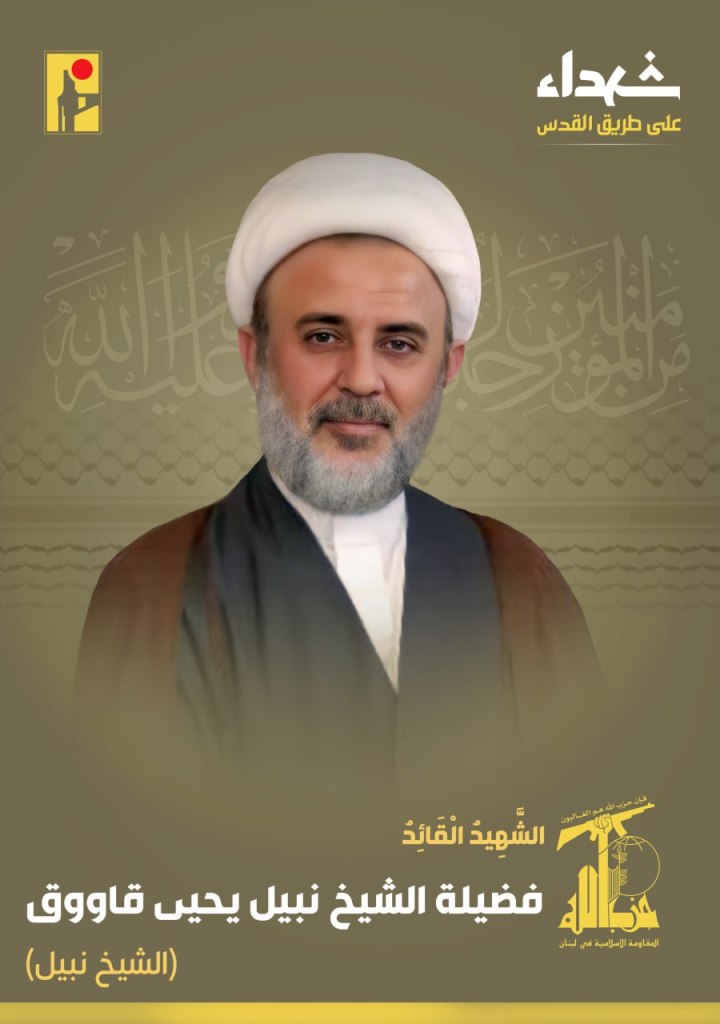 This is the Truth of Allah, the Most High, the Almighty. With great pride and honor, the Islamic Resistance exalts the martyr leader His Eminence Sheikh Nabil Qaouq “Sheikh Nabil,” born in 1964 from the town of Abba in southern Lebanon, who ascended as a martyr on the path to Al-Quds.