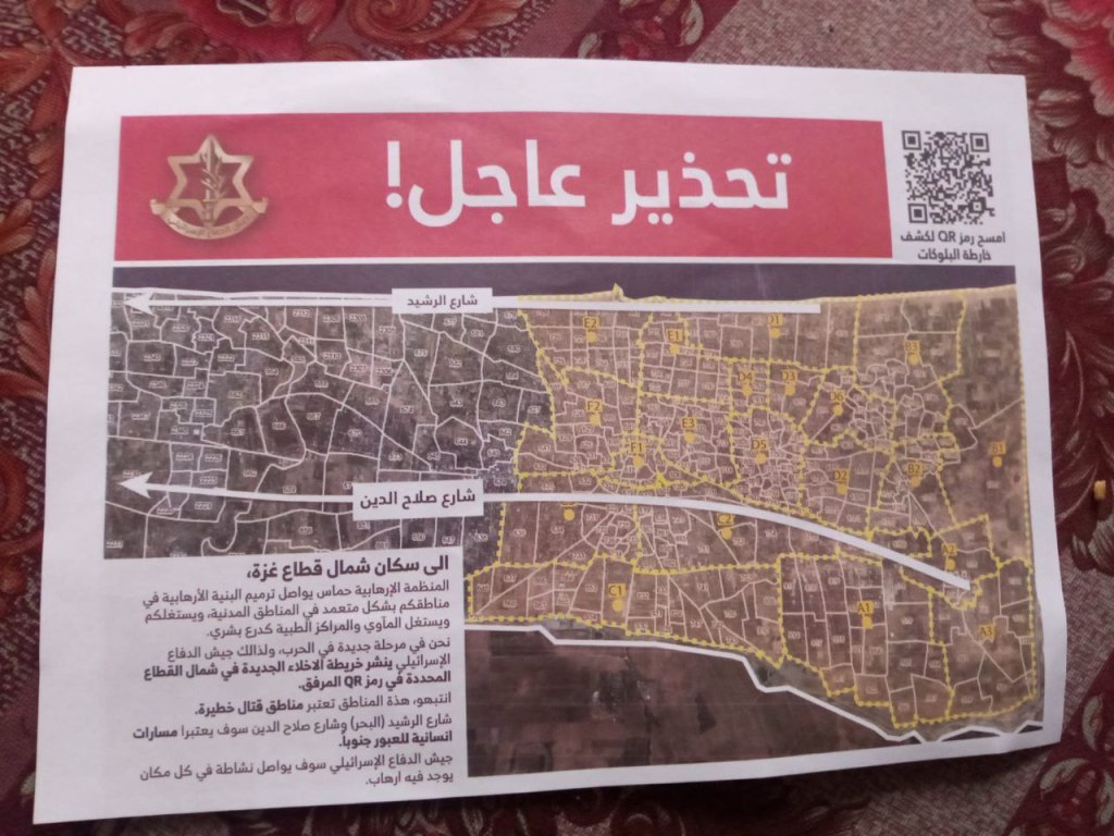 As part of its continuous psychological war, the IOF dropped hundreds of leaflets on the northern Gaza Strip for the first time in months, calling on residents of the entire northern Gaza Strip to evacuate to the already crowded south of the Strip via routes the IOF has been known to bomb.