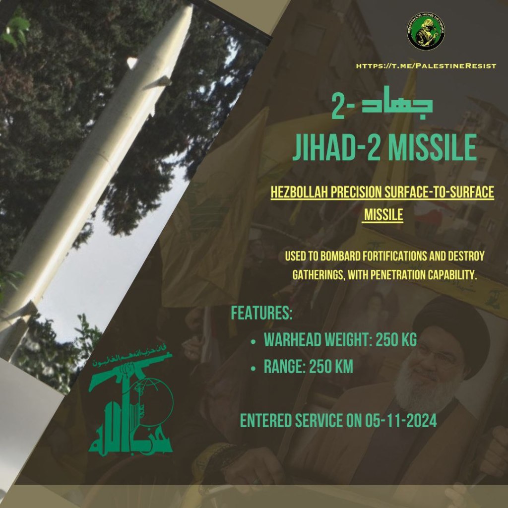 The list of Hezbollah’s rockets revealed in this war as of November 7th, 2024: Katyusha, Burkan, heavy Burkan, Martyr Jihad Mughniyeh (Jihad-1), Falaq-1 (50kg warhead), Falaq-2 (117kg warhead), Fadi-1 (83kg warhead, 70km range), Fadi-2 (170kg warhead, 100km range), Fadi-3, Fadi-4, Nour-1 (in use), Qader-1 (ballistic, 500kg warhead, 190km range), Qader-2 (in use; precision ballistic, 405kg warhead, 250km range), Nasr-1 (in use; precision, 100kg warhead, 100km range).