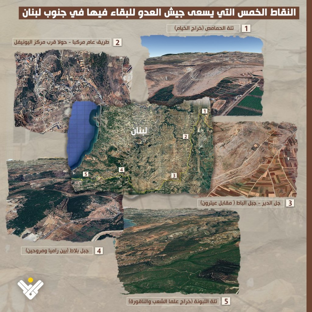 However, despite the withdrawal, “Israel” has retained 5 key positions within Lebanese territory, citing no immediate military significance but using them to reassure northern settlers ahead of their planned return by March. These positions include Labbouneh Hill, Balat Moutain, Jal al-Deir, Dawawir, and Hamamis Hill—each positioned to oversee Israeli northern settlements. Israeli officials confirmed the strategic nature of these sites was finalized last Friday during a ceasefire monitoring committee meeting.