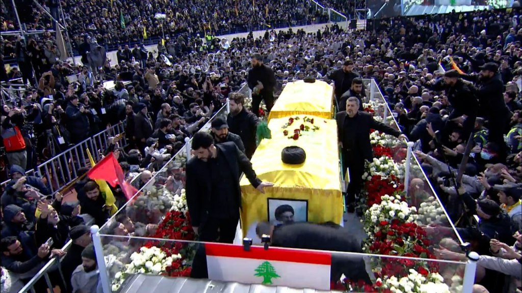 The funeral officially started at 13:00 (Beirut time) with masses at the stadium chanting in tribute to Hezbollah Secretary General Sheikh Naim Qassem, renewing allegiance to the path of resistance.