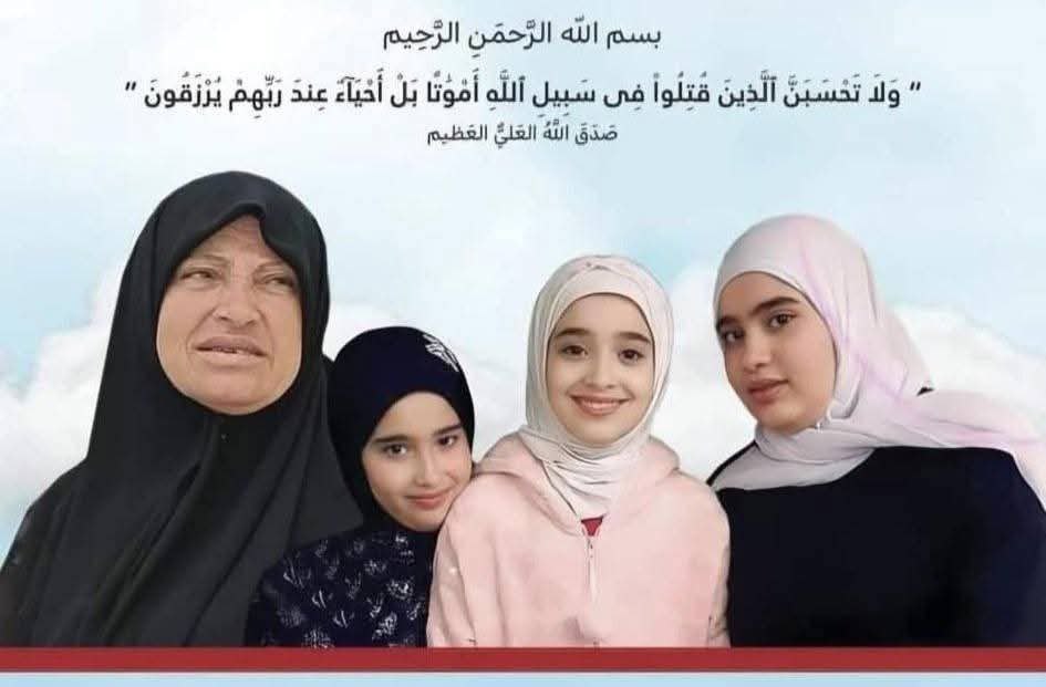 (Umm Adnan), was martyred with her three granddaughters when the Zionist attacked them on 5 November 2023. The Martyrs