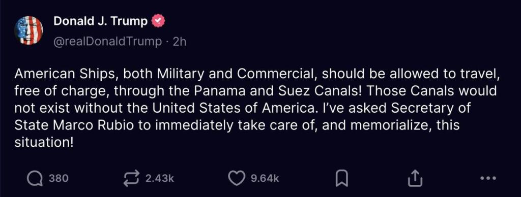 Writing on Truth Social, he claimed the US deserves toll-free access because it built and protected the canals, and directed Secretary of State Marco Rubio to act on the issue.