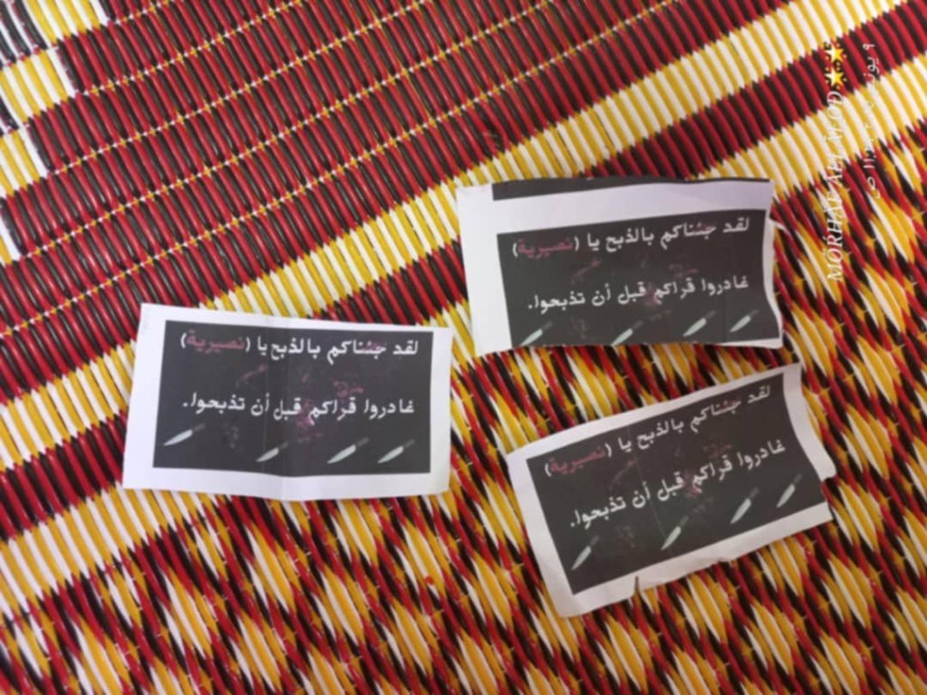 Jolani’s Hay’at Tahrir al-Sham terrorist militants in Syria are reportedly distributing leaflets in villages in western Homs, threatening Alawites with slaughter if they do not leave.