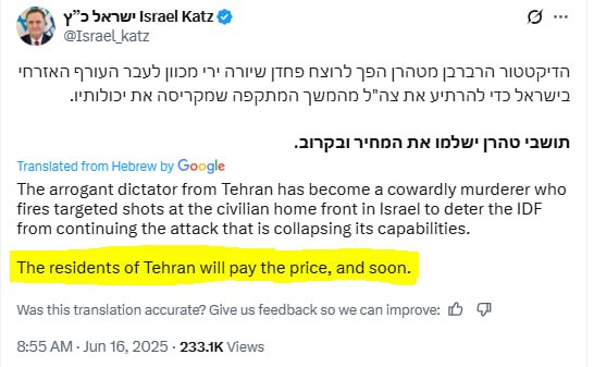 zionist Defense Minister, Katz, has publicly announced the regime’s intent to commit genocide against the 14 million citizens of Tehran — in a shocking post on his official X (Twitter) account.