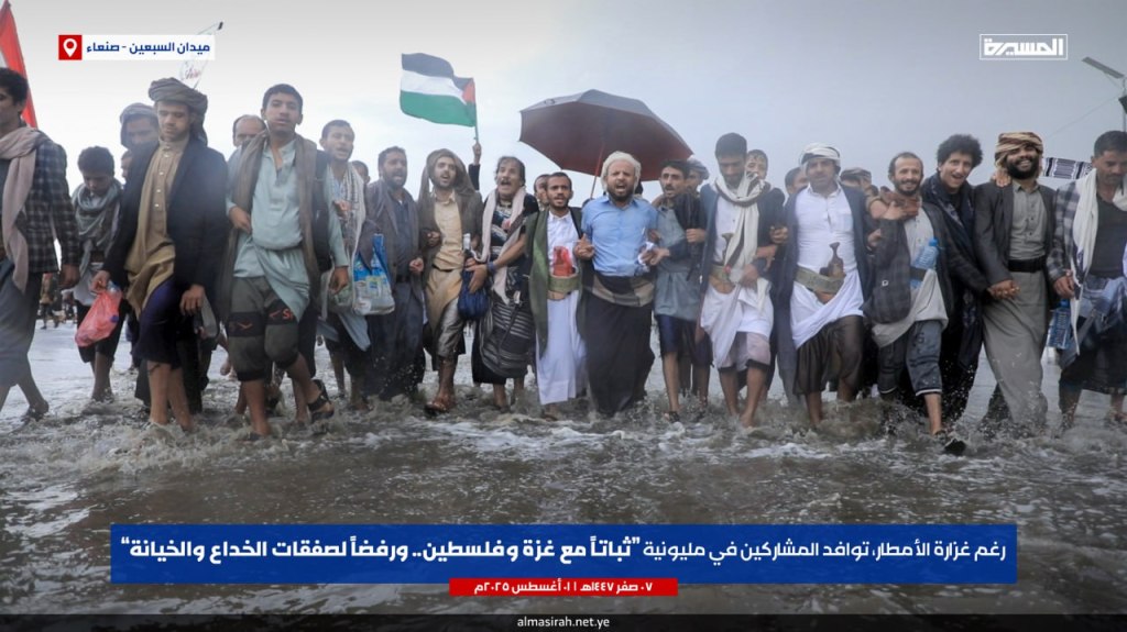 Despite heavy rain, participants flocked to Al Sabaeen Square in Sana’a in a million-man march under the slogan “in steadfastness with Gaza and Palestine… and in rejection of deals of deception and treason.”