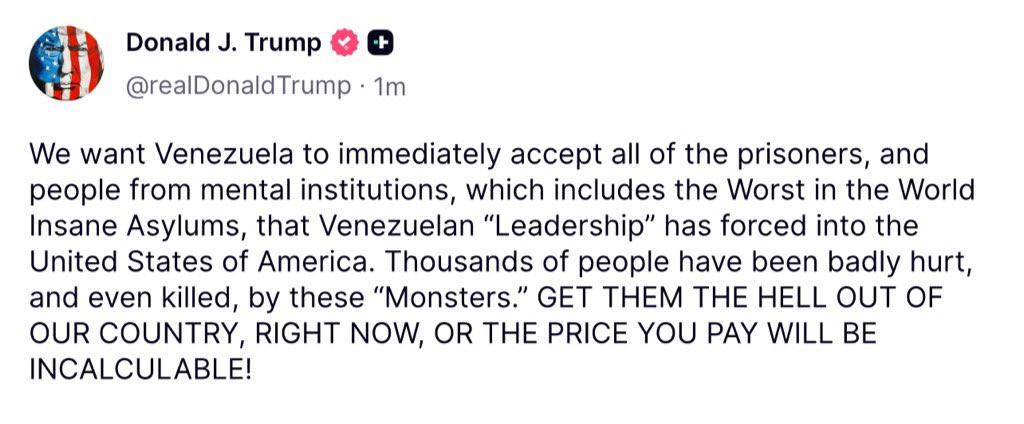 In his latest post on the social media platform Truth, US President Trump issues a final warning to Venezuela, demanding the leadership to accept prisoners or pay an “incalculable” price.