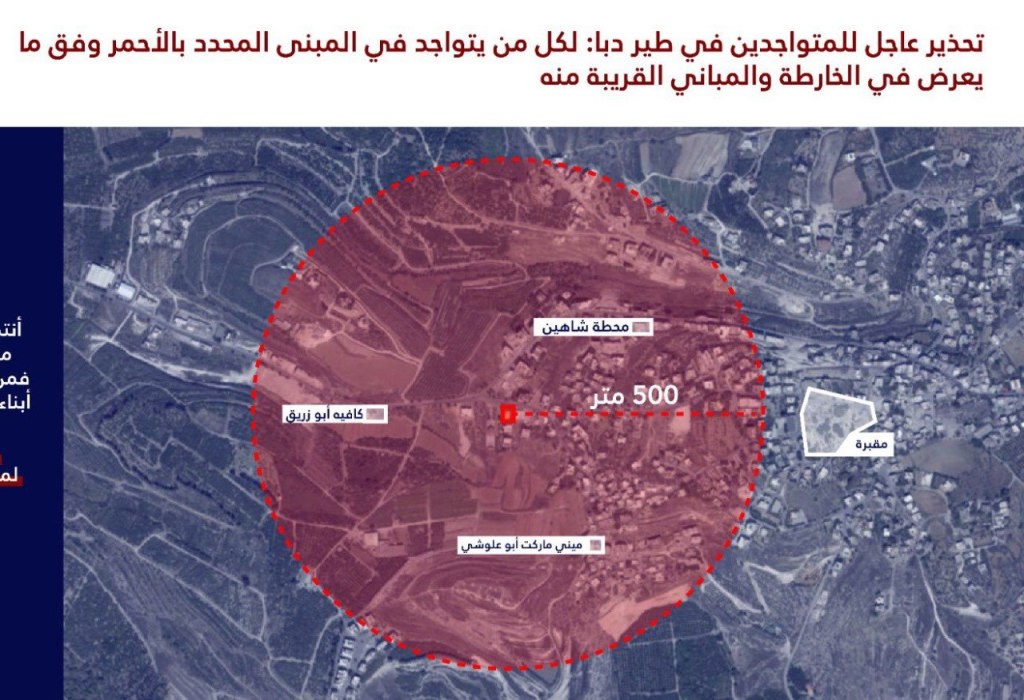 zionist colony announces it will bomb sites in Taybeh, the village of Aita al-Jabal, and Tayr Dibba in southern Lebanon, using the pretext of “Hezbollah military infrastructure” and ordering civilians in and around the marked buildings to move at least 500 meters away.