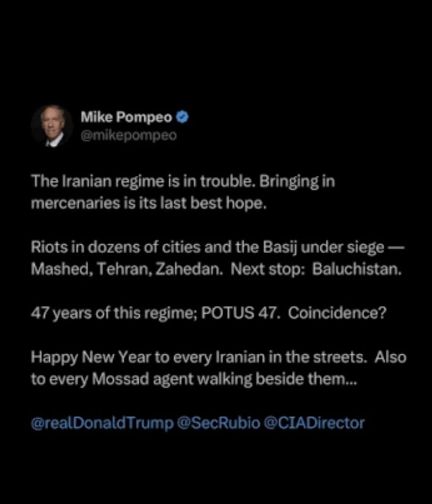 ‘Happy New Year to Iranians and Mossad agents beside them,’ Mike Pompeo says in social media post. [In reference to the foreign-orchestrated riots in Iran]