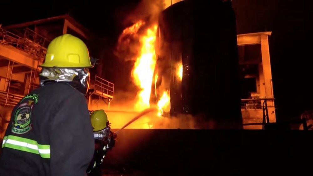 Firefighters work as huge fires erupted at a cement factory in Yemen after the Zionist military said it carried out airstrikes against Hudaydah Port and its vicinity, Hudaydah Governorate, Yemen, on May 5, 2025. (Photo via Reuters)