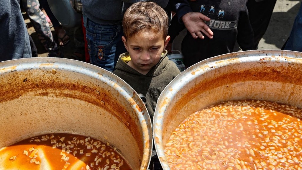 A Palestinian child waits to receive his portion of a hot meal, at a free food distribution point at the Nuseirat refugee camp in the central Gaza Strip on April 12. Exactly the same scenario as with the US aid pier: A looming catastrophe.