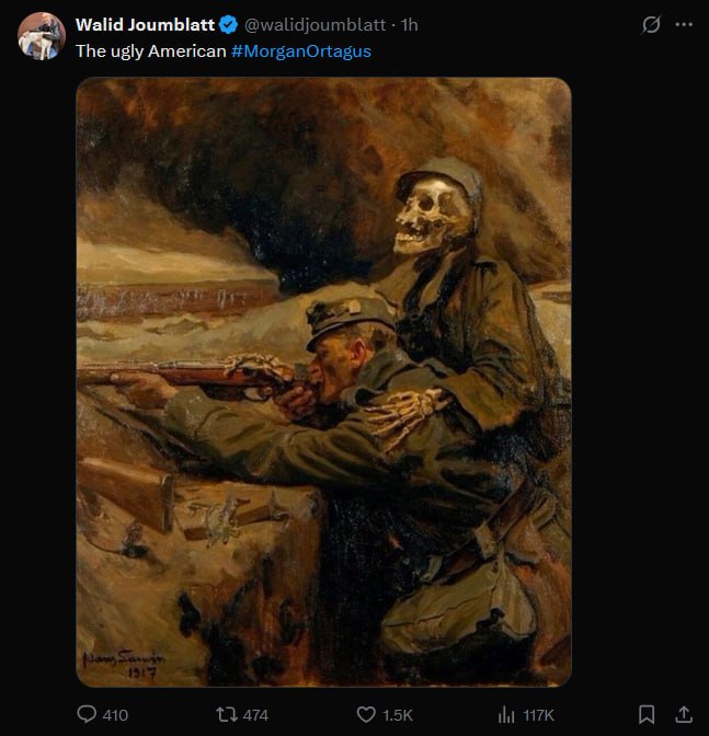 Former Lebanese Progressive Socialist Party (PSP) leader Walid Jumblatt responded to US envoy Morgan Ortagus’s comment about him on X, posting the following photo with the caption: “The ugly American # MorganOrtagus.” The Cradle Media