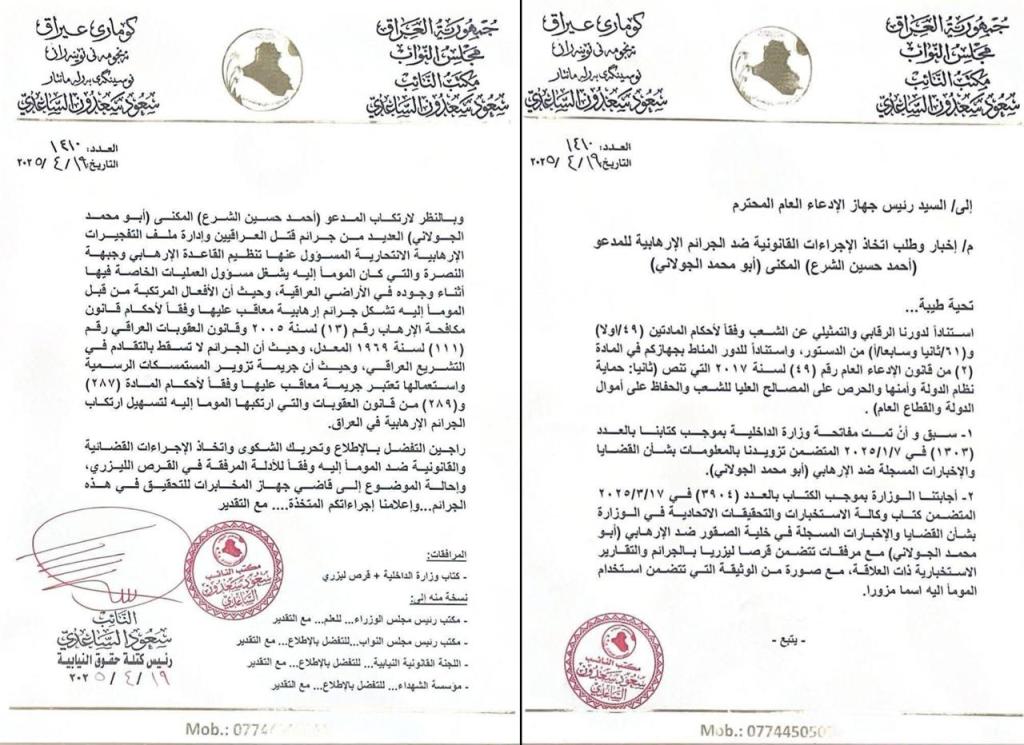 The letter, sent by Iraq’s Council of Representatives to the Office of the Public Prosecutor in Baghdad, calls for an investigation and possible arrest of Sharaa if he enters Iraqi territory.