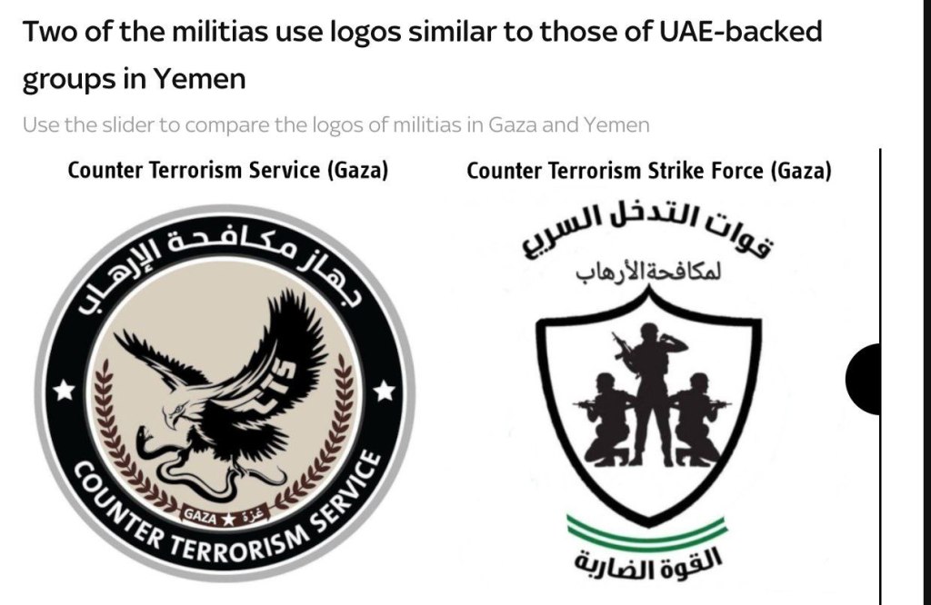 A new report found that logos used by the Jewish colony-backed militias in Gaza mirror those of UAE-backed groups in Yemen, and vehicles with UAE license plates have been spotted at militia sites. The findings point to a clear Emirati role in supporting the so-called “New Gaza” project.