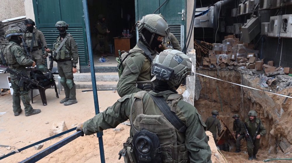 zionist troops surround what they call the entrance to a tunnel inside the al-Shifa Hospital complex in Gaza City in the northern Gaza Strip on November 22, 2023. (Photo by AFP) -